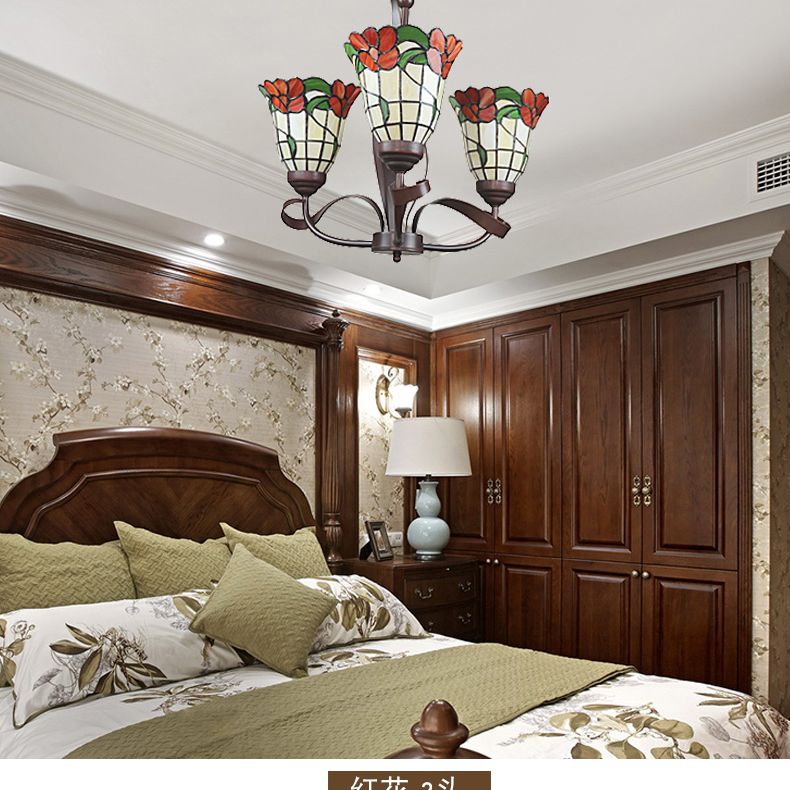 Tiffany Sunflower/Rose Chandelier 3/4 Lights Stained Art Glass Pendant Light Kit in Red/Green for Bedroom