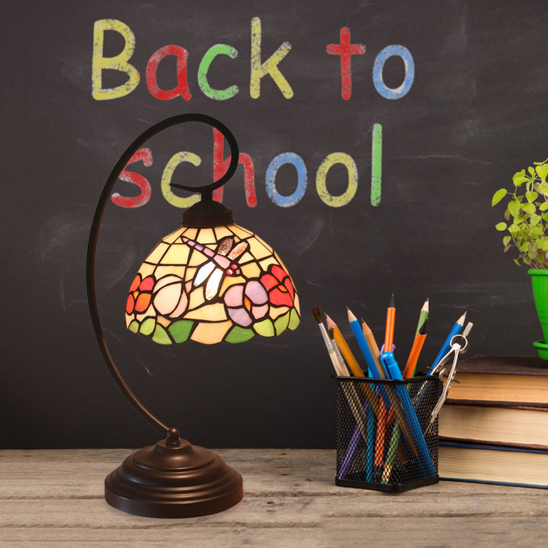 Stained Glass Dome Shade Desk Lamp Tiffany Style 1 Head Beige/Blue Dragonfly Patterned Table Lighting with Swirl Arm