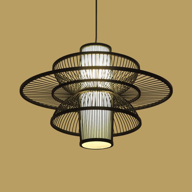 Bamboo Double-Decker Domed Hanging Lamp Rustic 1 Light Suspended Light for Restaurant Dining Room
