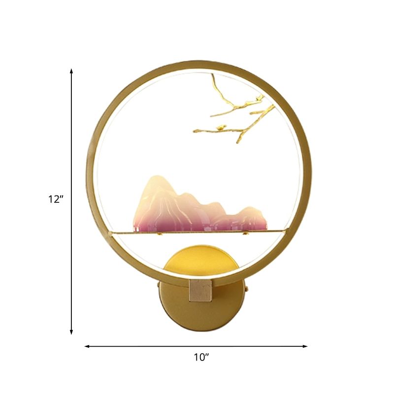 LED Bedside Mountain and Branch Mural Light Oriental Style Gold Wall Mounted Light with Round Metal Shade