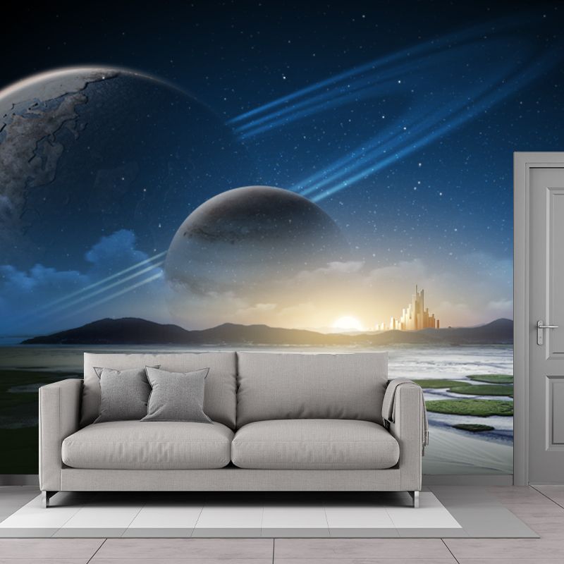 Aqua Sunrise River Scenery Mural Orbital Planet Sci-Fi Moisture Resistant Wall Decor