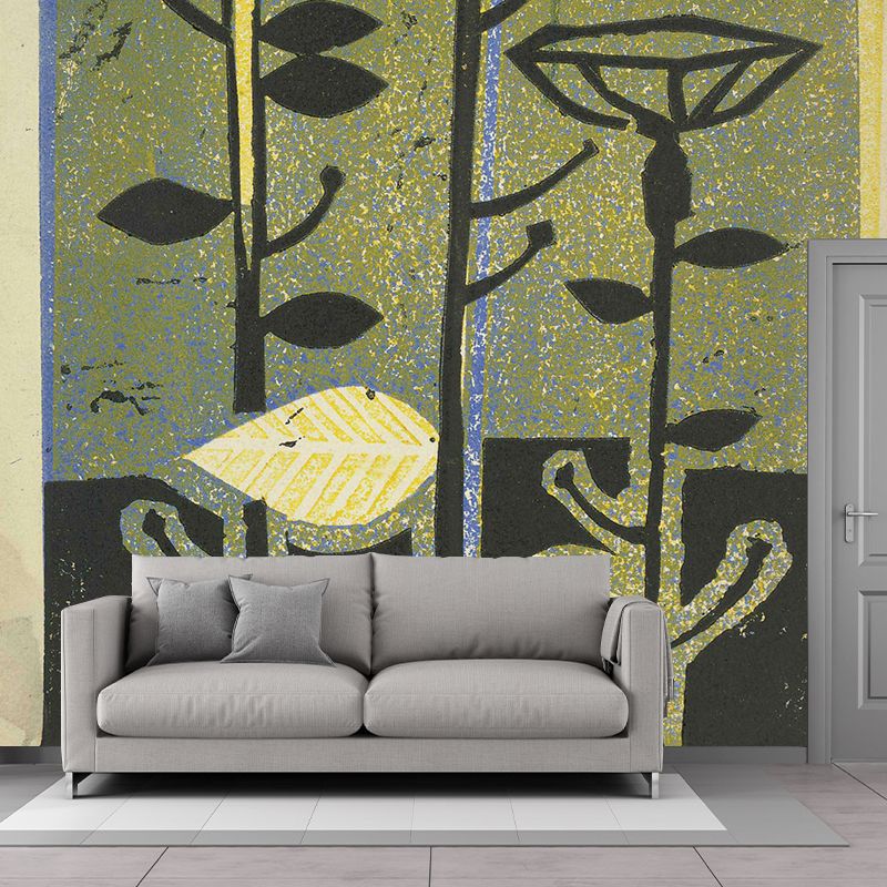 Art Deco Flowers Painting Murals Yellow-Brown Bedroom Wall Decoration, Custom-Print