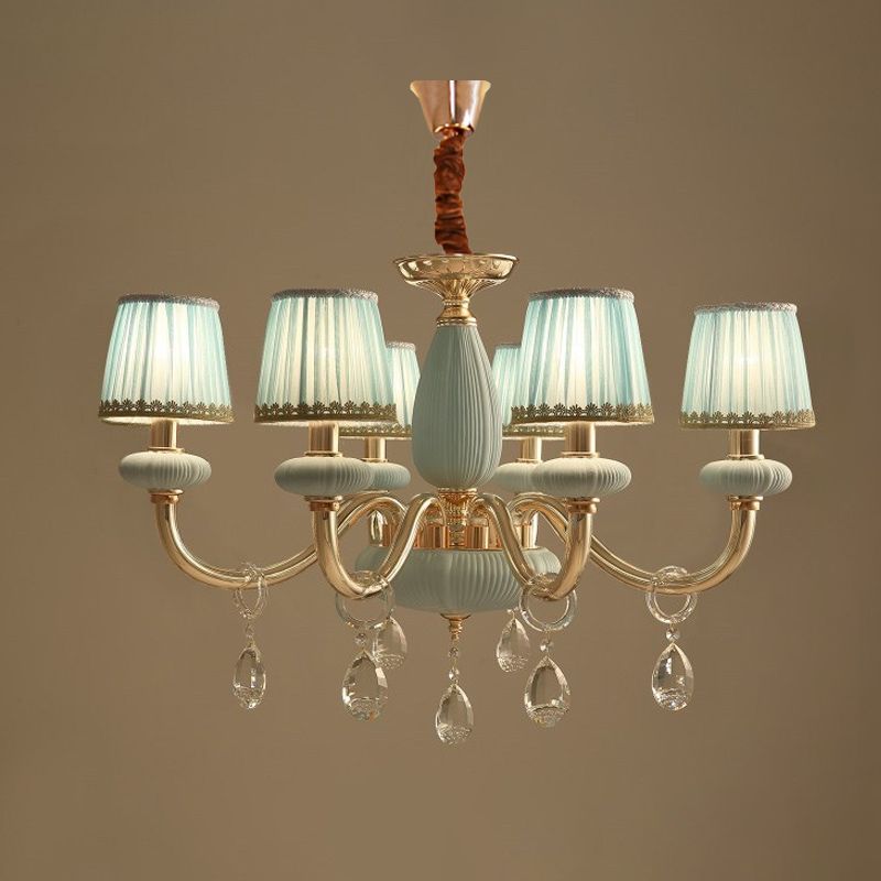 Blue Barrel Ceiling Light Traditionalist Fabric 6-Bulb Bedroom Hanging Chandelier with Crystal Decor
