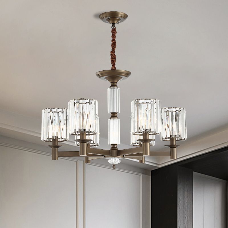 Traditional Cylindrical Pendant Light Fixture 6 Heads Crystal Hanging Chandelier in BrassTraditional Cylindrical Pendant Light Fixture 6 Heads Crystal Hanging Chandelier in Brass