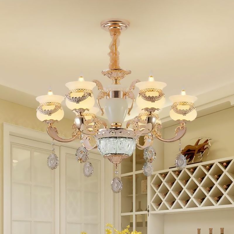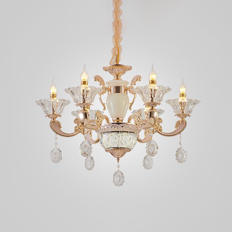 Clear Glass Candle Chandelier Traditional 6/8 Heads Bedroom Hanging Light in Gold with Crystal Draping