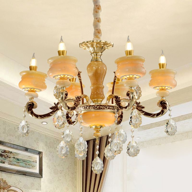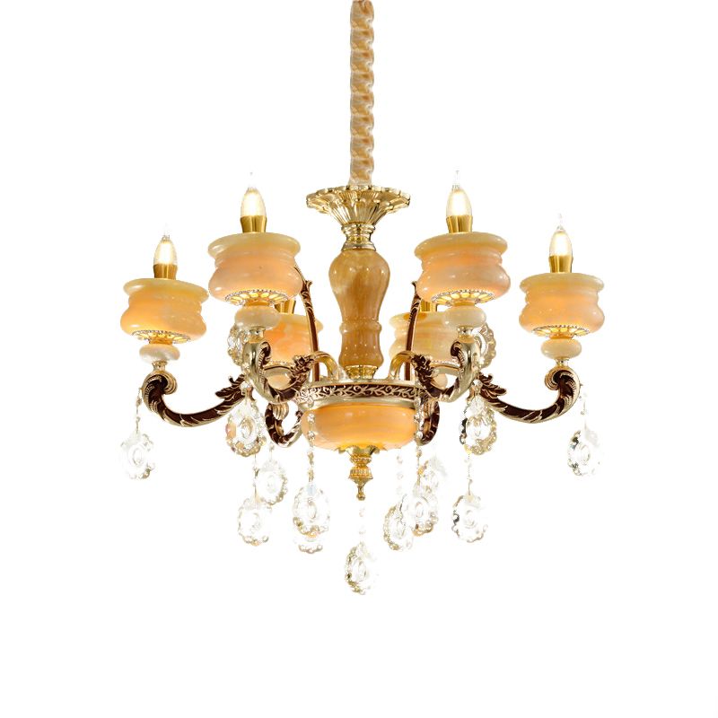 Gold Candlestick Hanging Chandelier Vintage Jade 6/8 Bulbs Bedroom Pendant Light with Crystal Drop
