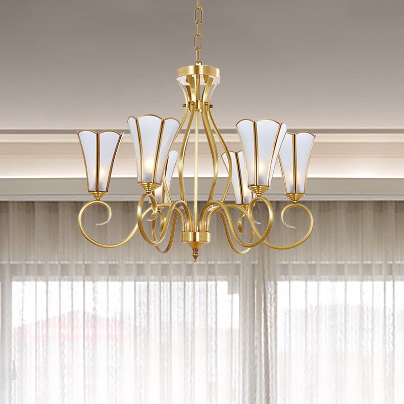 Gold Finish 6 Lights Chandelier Colonial Frosted Glass Flower Shaped Ceiling Pendant Light with Swirled Arm