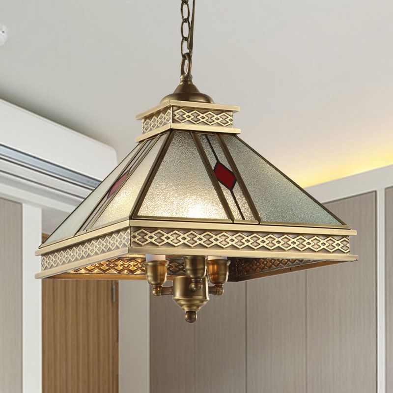 Pyramid Shaped Bedroom Ceiling Chandelier Retro Frosted Glass 3 Lights Gold Hanging Light Kit