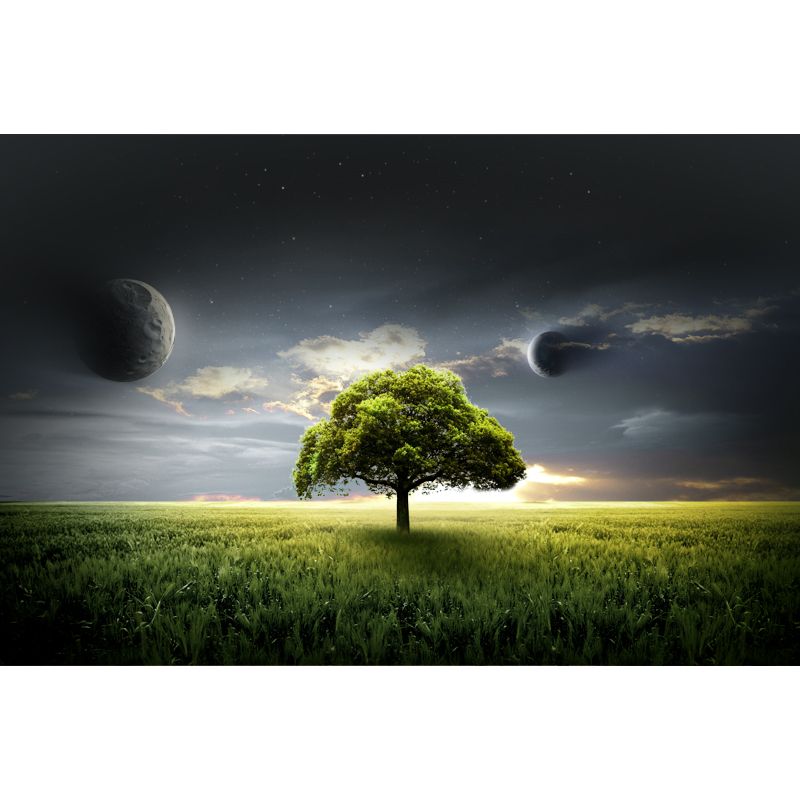 Blue-Green Futuristic Mural Decal Full-Size Tree of Life and Planets Wall Covering