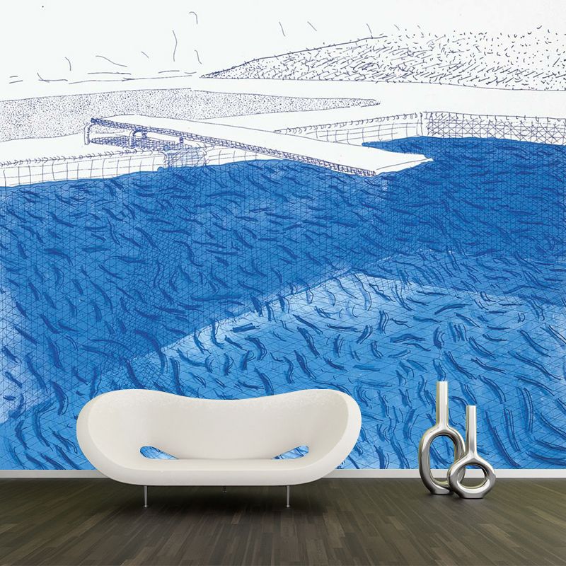 Blue-White Artistry Wallpaper Murals Whole Swimming Pool with Fishes Drawing Wall Decor for Hall
