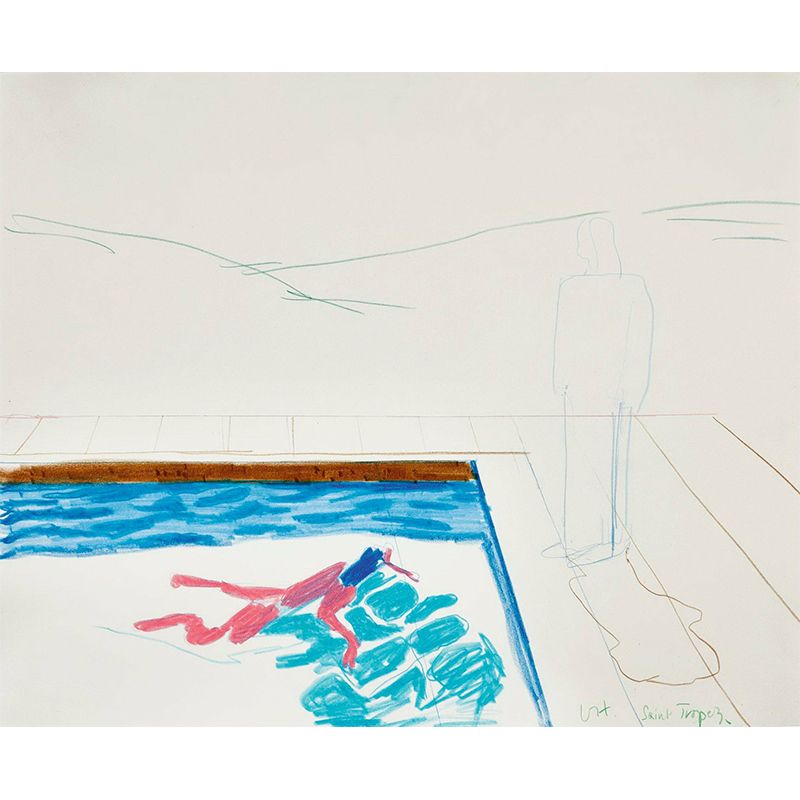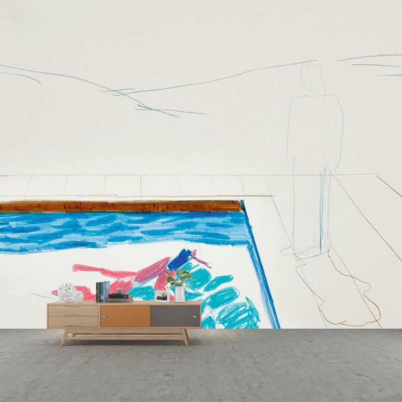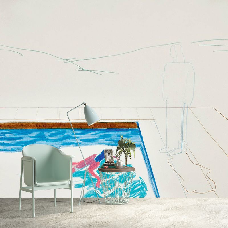 Sunbathing at Pool Wall Mural Decal Purple-Blue Modern Art Wall Covering for Living Room