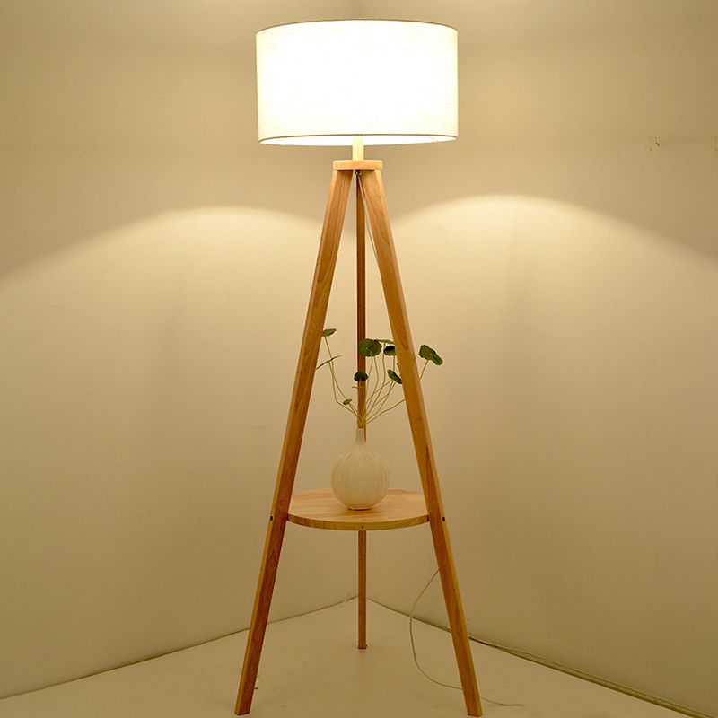 Tri-leg sala de estar iluminación de madera 1 cabezal lámpara de piso moderno con tono de tela de tambor en beige/marrón