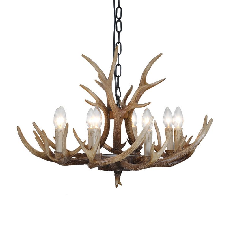 Brown 4/6/8 têtes CHANDELIER LIGHTING RUSTIC Resin Resin Candle Suspension Lampe avec bois pour salle à manger