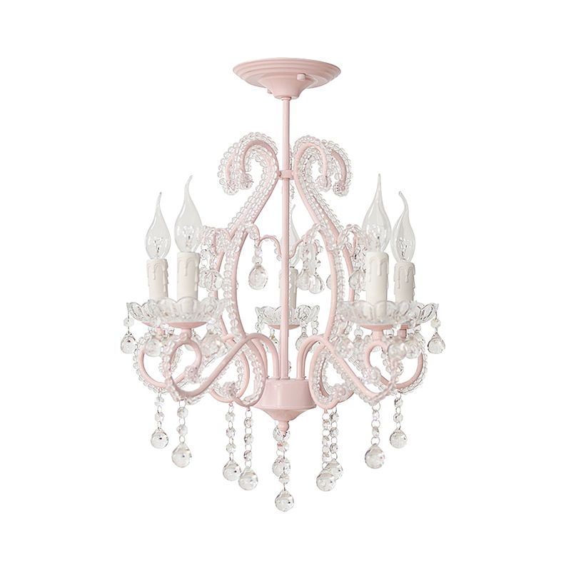 Prendeuse de lustre géométrique Lumière avec un accent de perle en cristal Macaron 5 lumières Plafond Pendre Lumière en rose