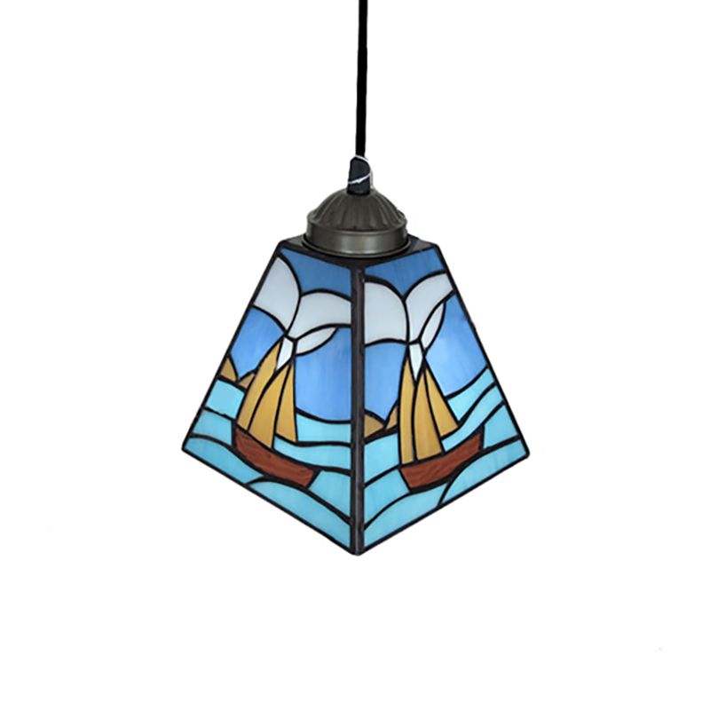 1-Light Dining Room Pendant Lighting Tiffany Blue Hanging Ceiling Light with Geometric/Boat Stained Glass Shade