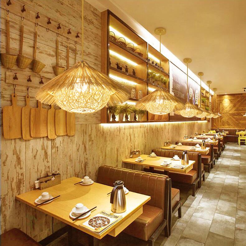 1 Light Farmhouse Shape Hanging Ceiling Light Japanese Fringed Rattan Hanging Light for Restaurant
