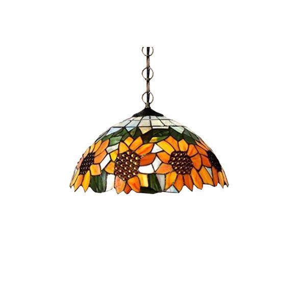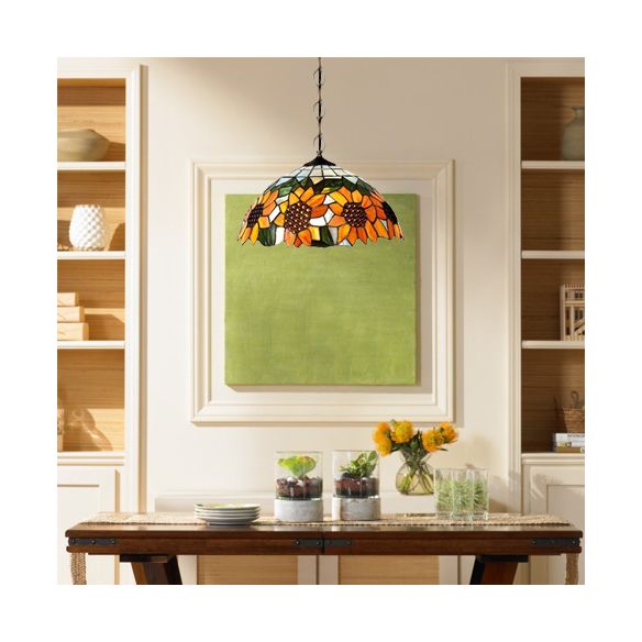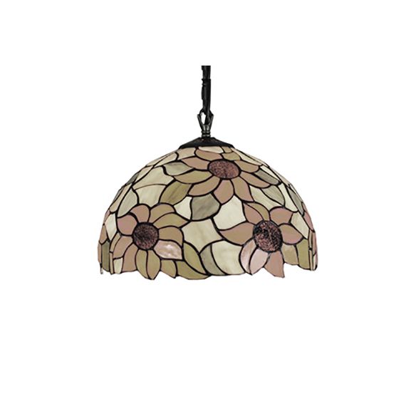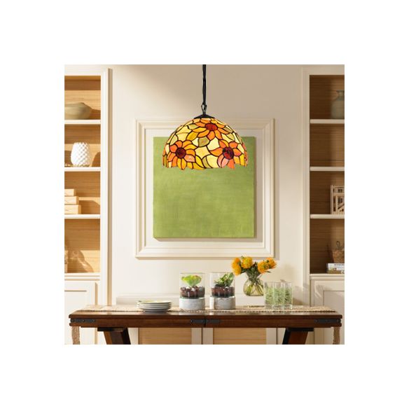 12"/16" Wide Domed Hanging Lamp Tiffany-Style 1 Bulb Black Hand Cut Glass Pendant Ceiling Light with Sunflower Pattern, A/B/C/D