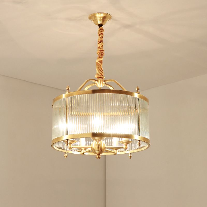 3/5/6 Lights Chandelier Light Colonial Drum Clear Ribbed Glass Ceiling Lamp in Polished Brass, Small/Medium/Large