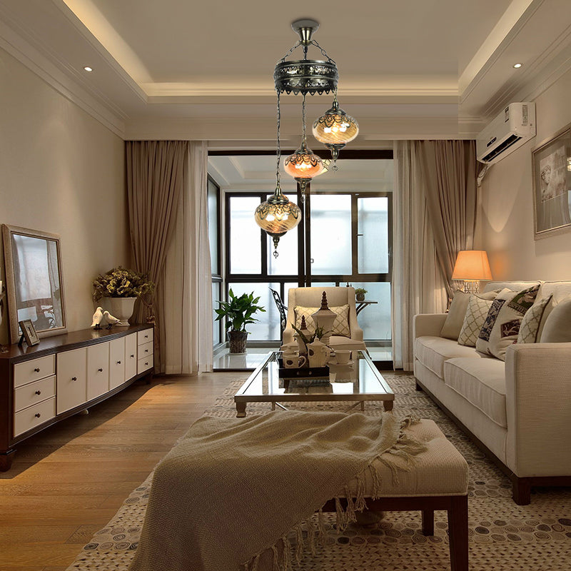 3/5 Heads Amber Swirl Glass Pendant Light Traditional Bronze Oval Living Room Hanging Chandelier