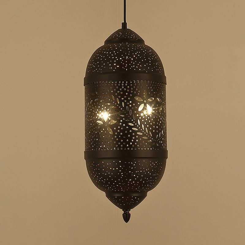 3-Light Hanging Light Kit Arab Etched Cylindrical Metal Ceiling Chandelier in Black for Dining Room