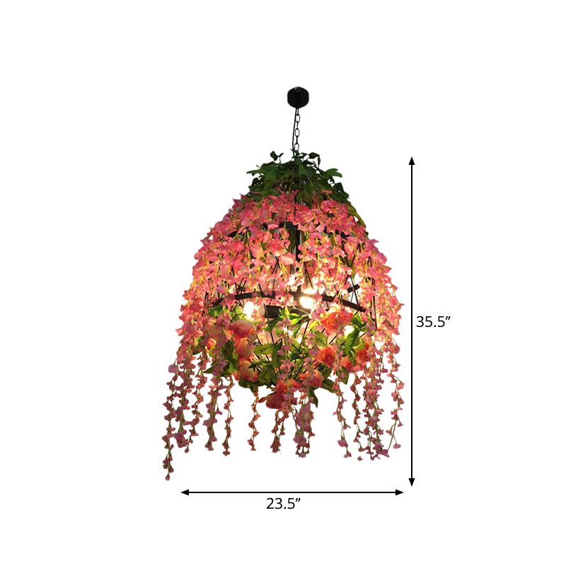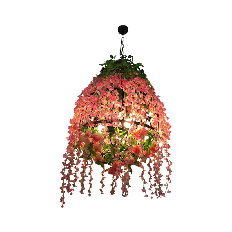 4 Heads Hanging Chandelier Industrial Restaurant Floral Pendant Light Kit with Wire Cage Metal Shade in Pink