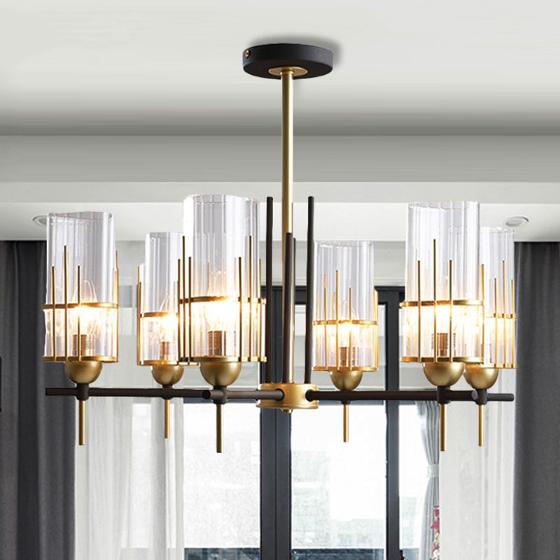 6-Head Black and Gold Chandelier Pendant Contemporary Triangular Prism Clear Glass Suspension Lamp