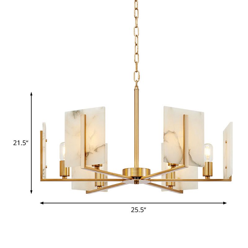 6 Lights Chandelier Pendant Light Colonial Expose Bulb Metal Suspension Lamp in Gold with Rectangle Marble Panel