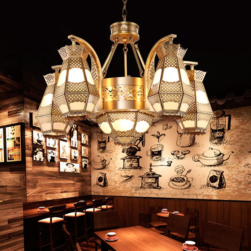 8 Heads Diamond Pendant Chandelier Arab Style Brass Opal Glass Hanging Light Fixture with Curved Arm