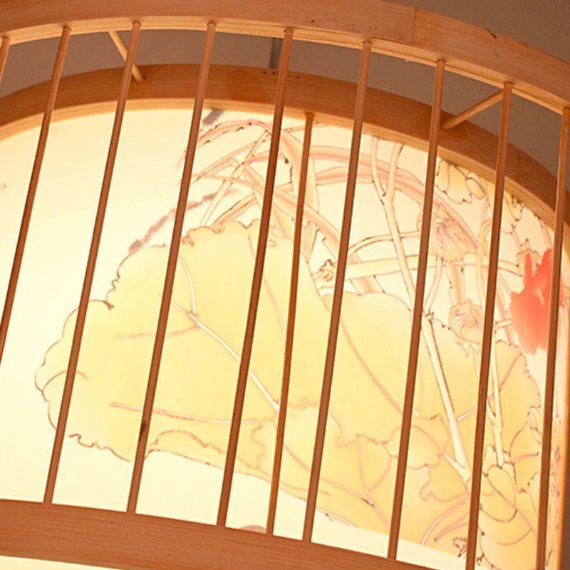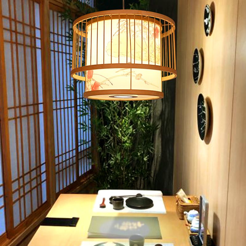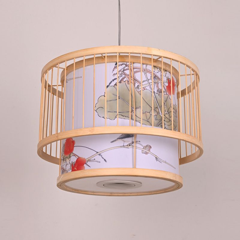 Asian Style Restaurant Pendant Light Cylindrical Bamboo Drop Lamp with Printed Shade