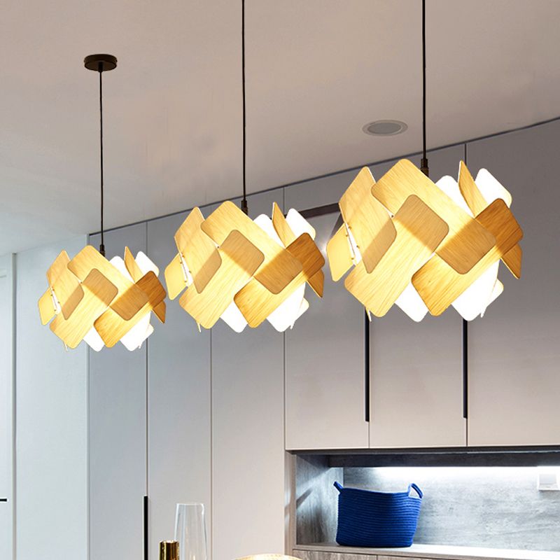 Beige Spliced Circle Chandelier Modernist 3 Heads Wood Hanging Light Fixture over Dining Table