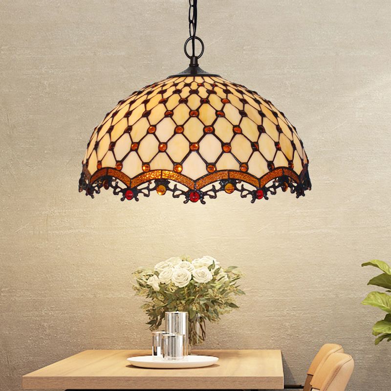 Beige Stained Glass Ceiling Lamp Scalloped 1 Light Mediterranean Suspension Pendant Light for Kitchen