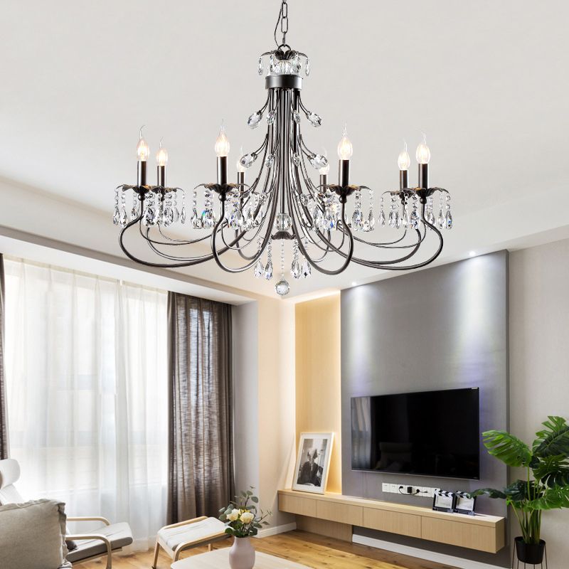 Black Curving Chandelier Lamp Farmhouse Metal Living Room Crystal Pendant Lighting with Candle Design