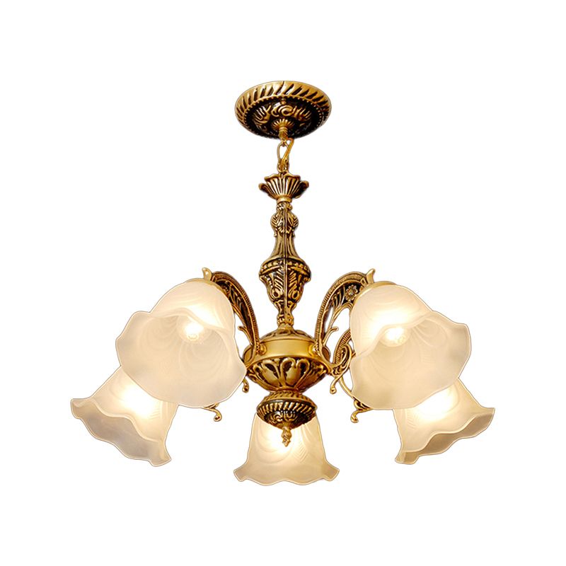 Brass Flower Chandelier Lamp Antique Frosted Glass 5-Head Living Room Ceiling Hang Light