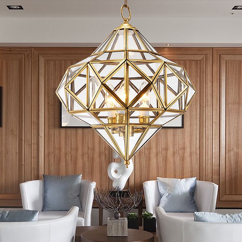 Clear Glass Geometrical Chandelier Lamp Retro 3 Bulbs Brass Pendant Lighting Fixture for Bedroom
