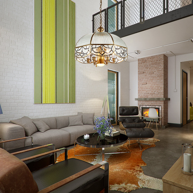 Colonial Scalloped Hanging Pendant 7 Heads Frosted Prismatic Glass Suspended Lighting Fixture in Brass