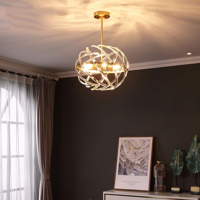 Contemporary Sphere Hanging Chandelier Metal 6 Bulbs Suspension Light in Gold with Crystal Tube Cage for Dining Room