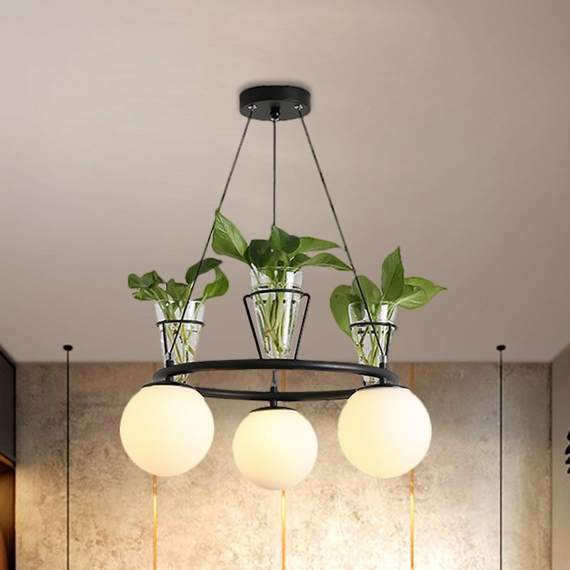 Cream Glass Globe Ceiling Chandelier Warehouse 3/5-Light Dining Room Hanging Light Kit in Black with Metal Ring Design