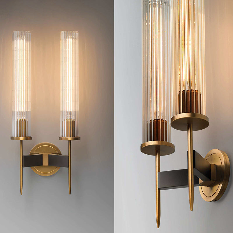 Cylinder Shape Sconce Lamp Nordic Style Brass Wall Light with Pressed Ribbed Glass Shade