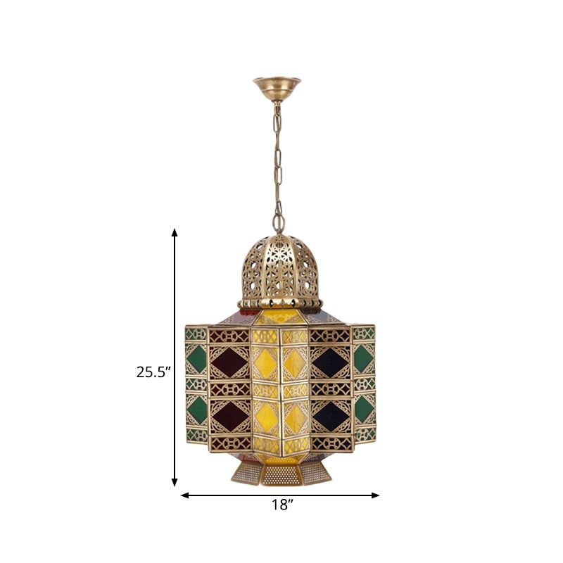 Decorative Lantern Pendant Light 6-Bulb Stained Glass Hanging Chandelier in Brass for Living Room