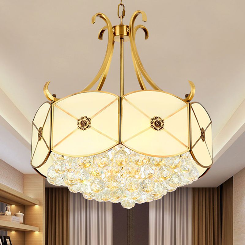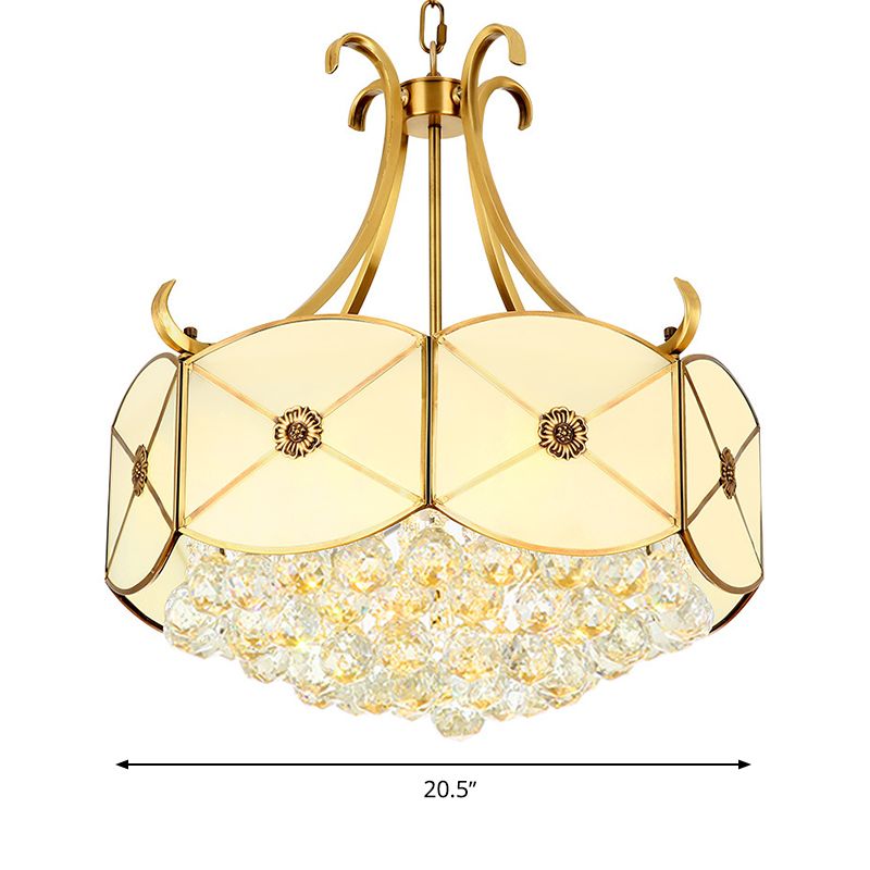 Drum Restaurant Ceiling Chandelier Colonial Ivory Glass 4 Heads Gold Hanging Light Fixture with Crystal Ball