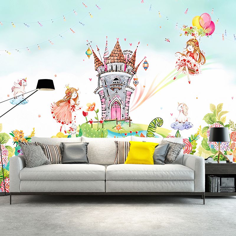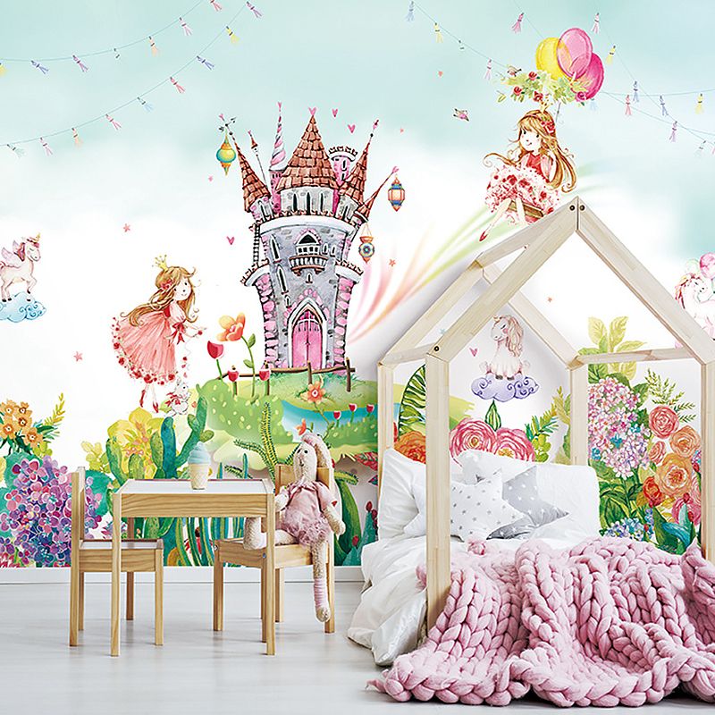 Enormous Illustration Contemporary Mural Wallpaper for Kids with Castle and Princess Pattern in Pink and Green