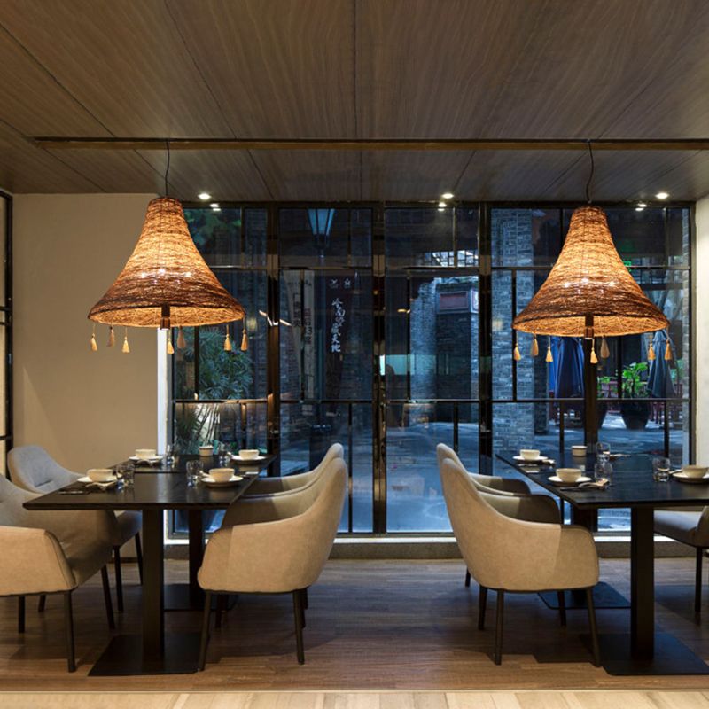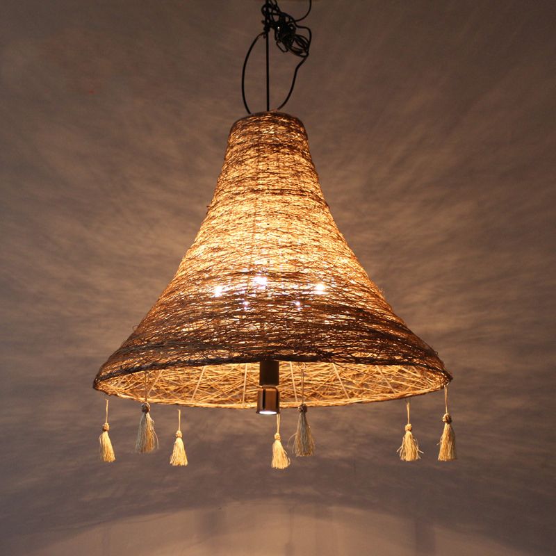 Flared Manila Rope Suspension Pendant Asian 23.5"/31.5" Width 3 Bulbs Yellow Chandelier Light with Tassel Deco