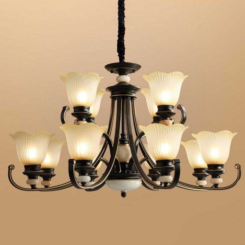 Flower Shaped Frosted Glass Chandelier Lighting Classic Dining Room Pendant Light in Black