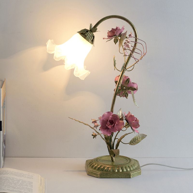 Frosted Milky Glass Ruffle Nightstand Lamp Pastoral Style 1-Light Bedroom Night Light with Green Arm and Flower Deco