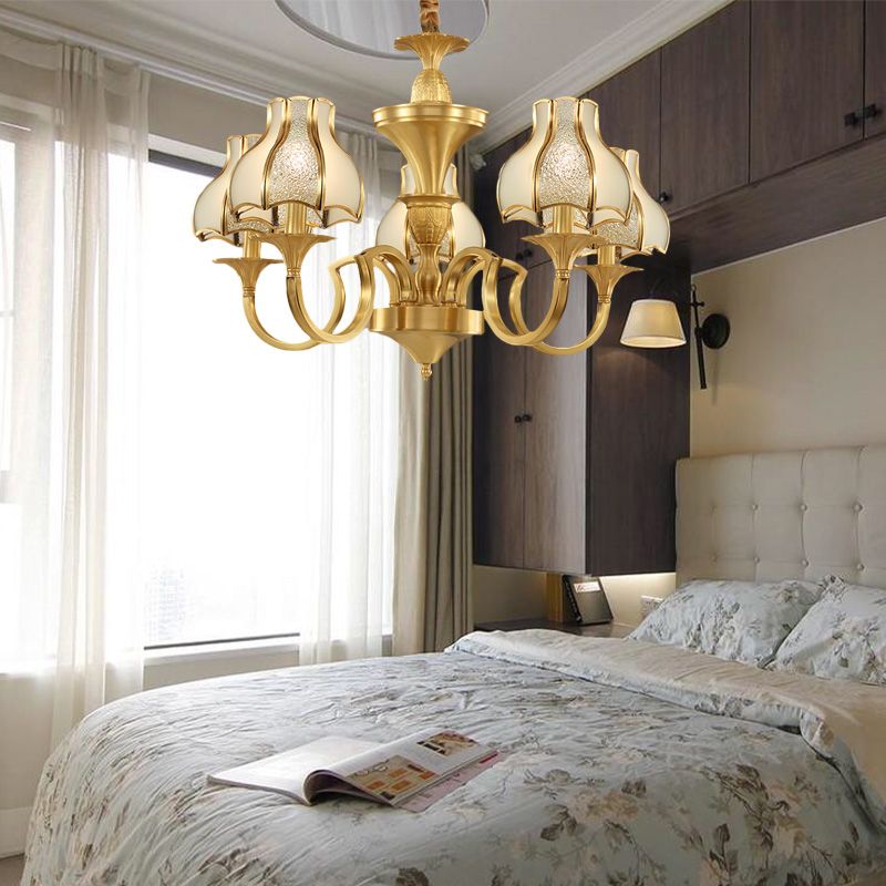 Gold 5/6 Heads Chandelier Light Colonialist Metal Curved Arm Suspended Lighting Fixture with Opal-White Glass Shade
