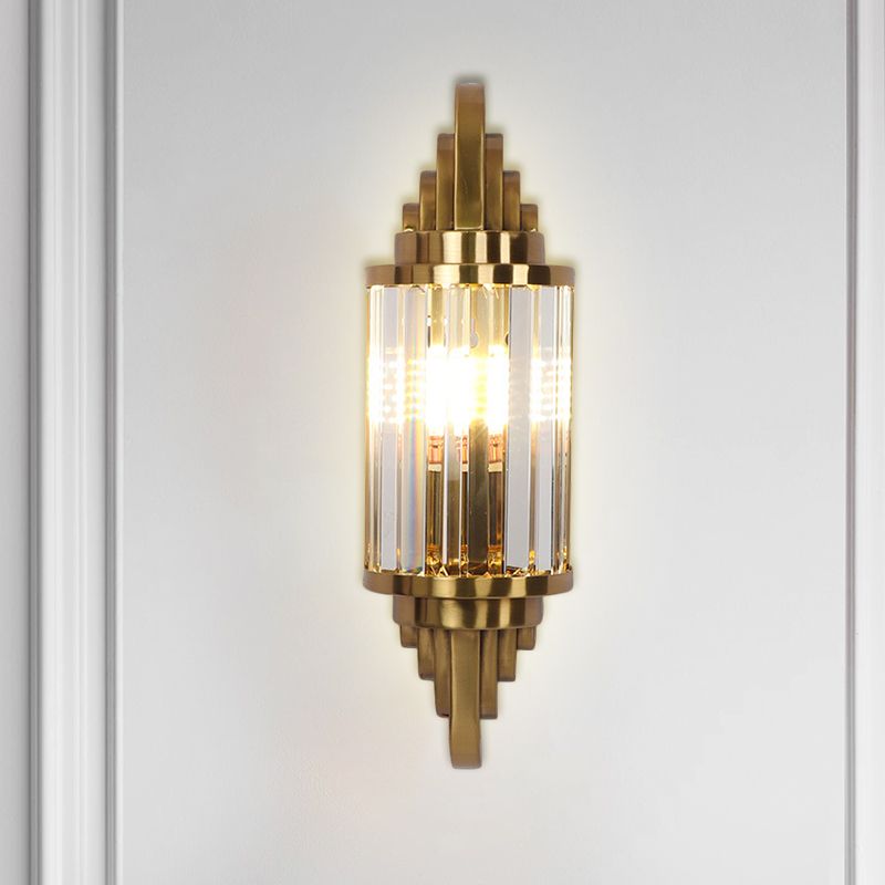 Gold Finish Half Cylinder Sconce Postmodern 1-Head Crystal Prisms Wall Light Fixture for Living Room