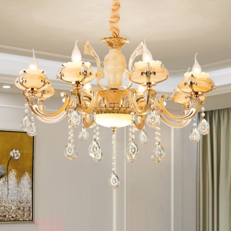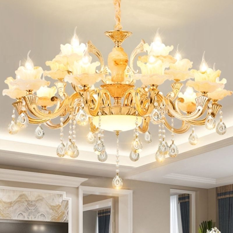 Gold Floral Shade Chandelier Light Retro Glass Living Room Pendant Light Fixture with Hanging Crystal