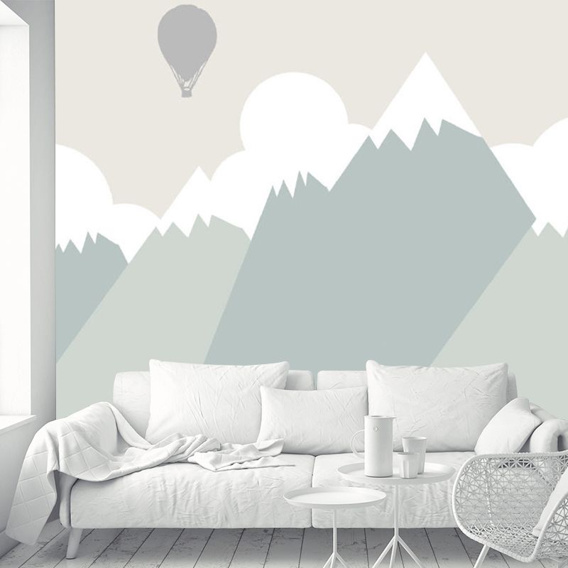 Hot Air Balloon Wall Murals in Grey and Green, Kids Style Mountain Wall Decor for Home