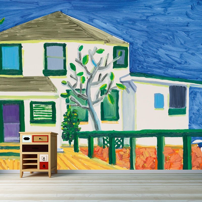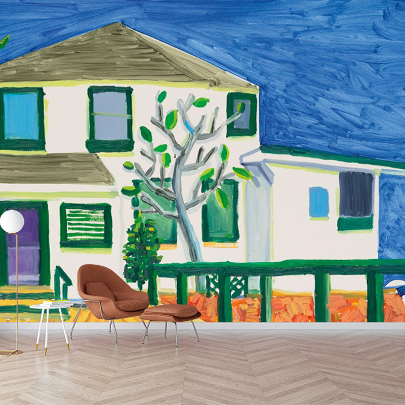 Large Storey House Wallpaper Murals Blue-White Non-Woven Wall Art, Moisture Resistant, Custom Size