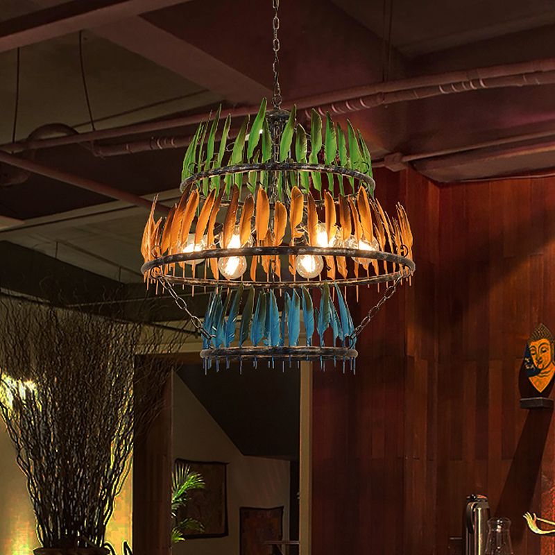 Layered Iron Chandelier Lamp Factory 6 Heads Restaurant Suspension Light in Black with Feather Design